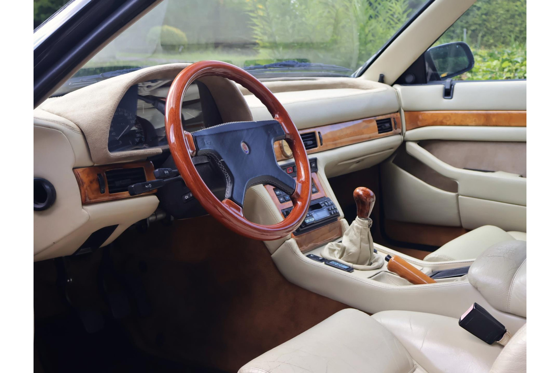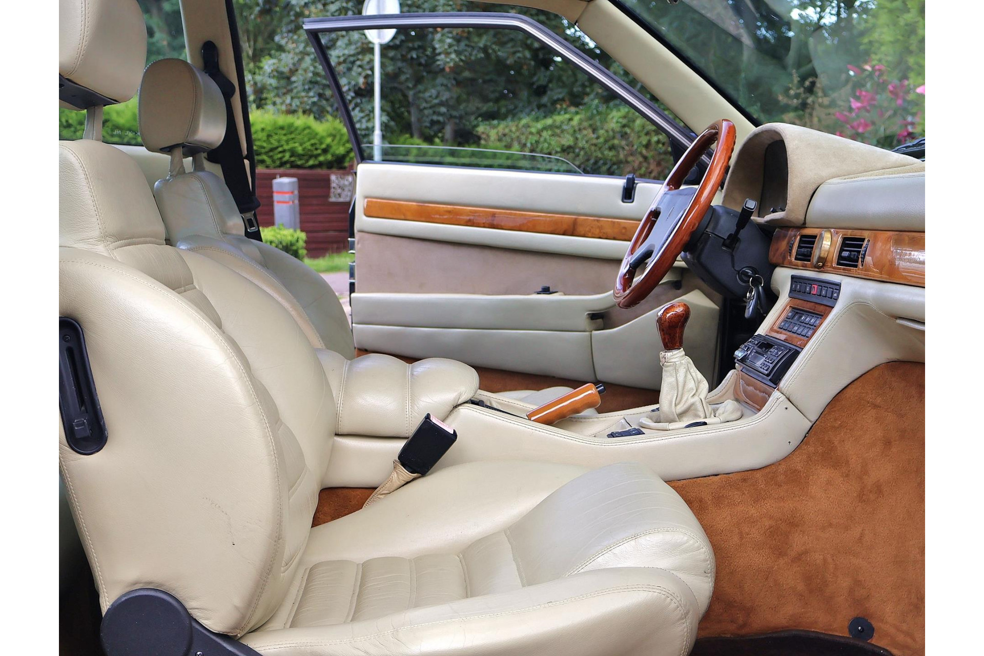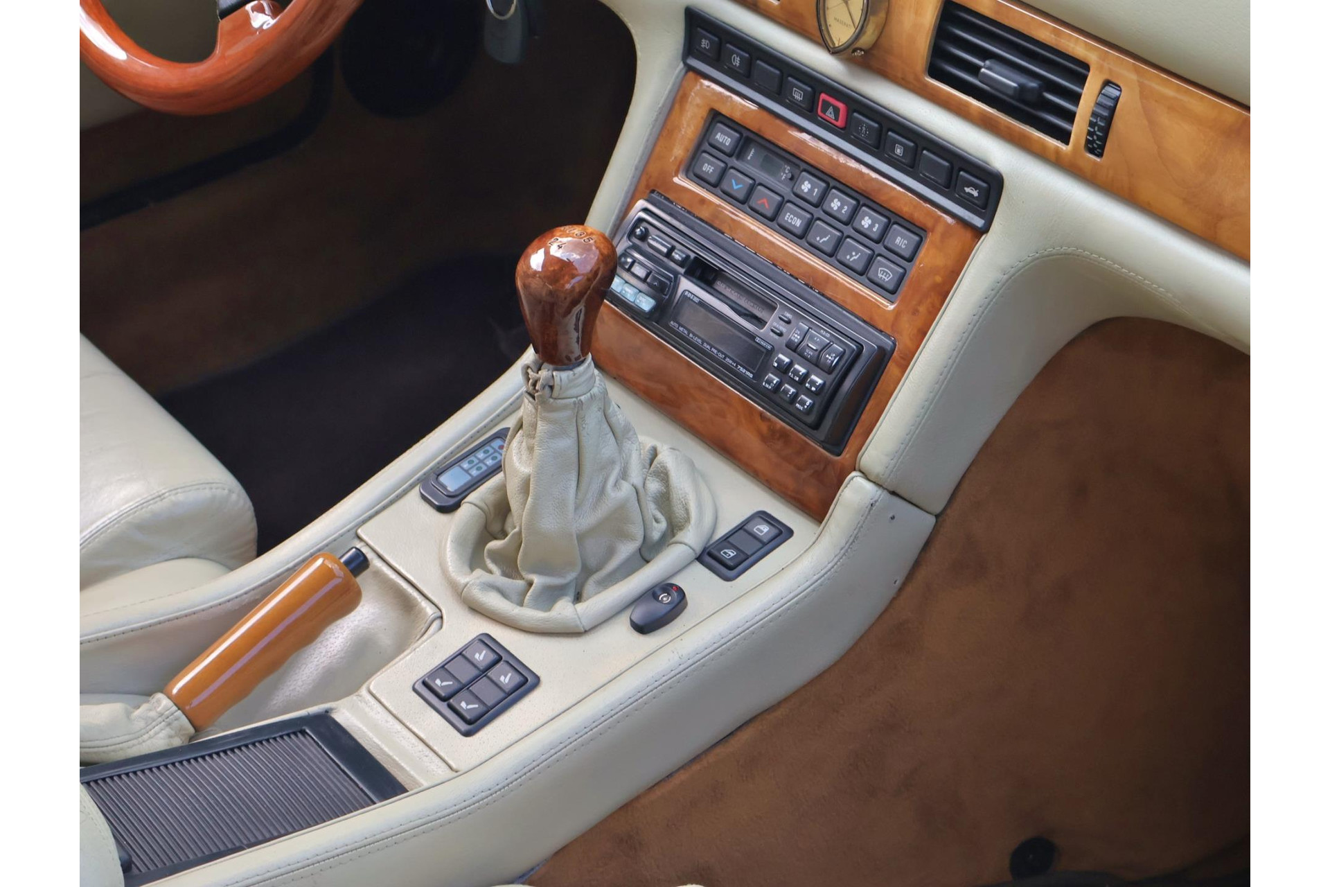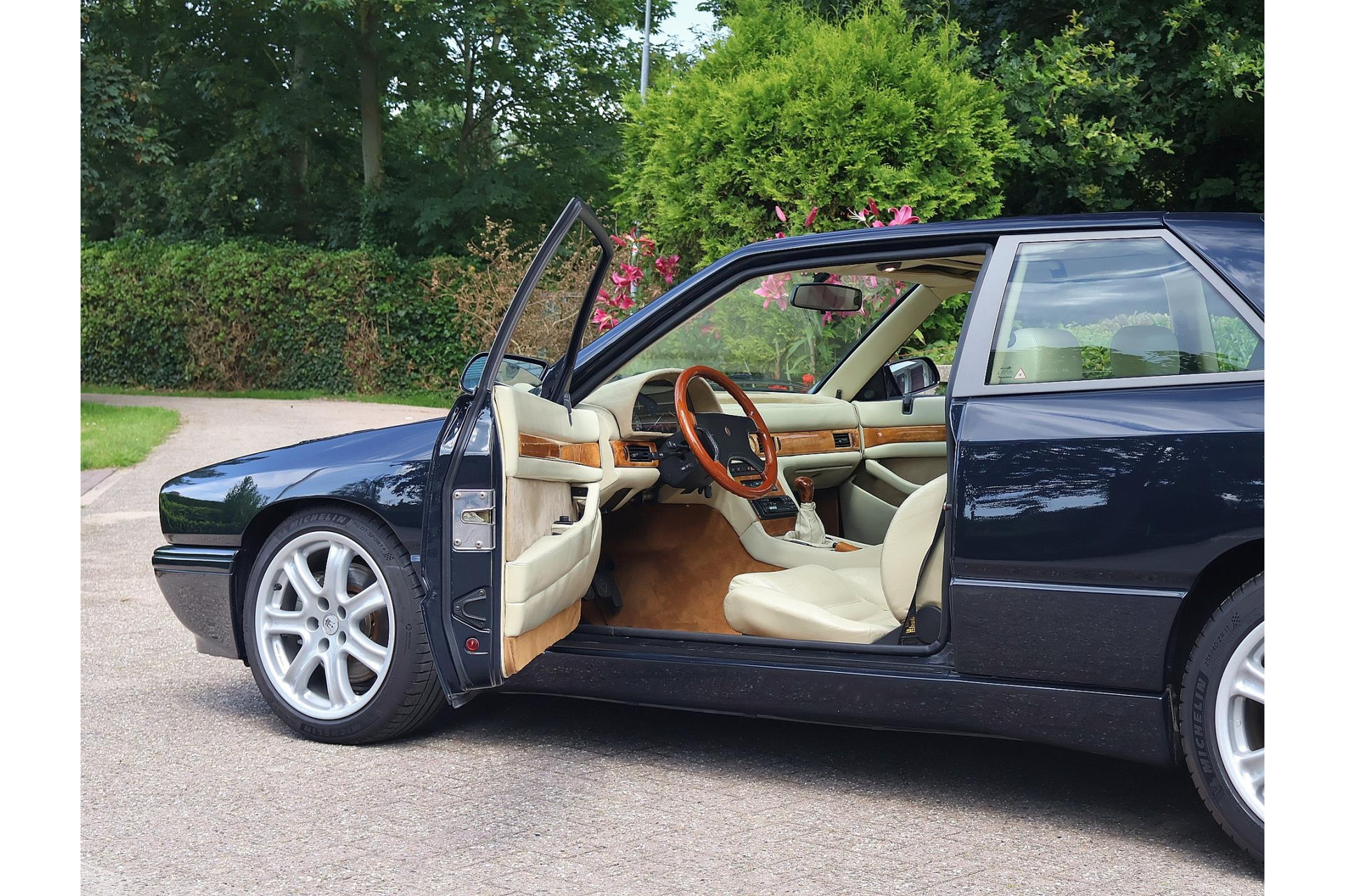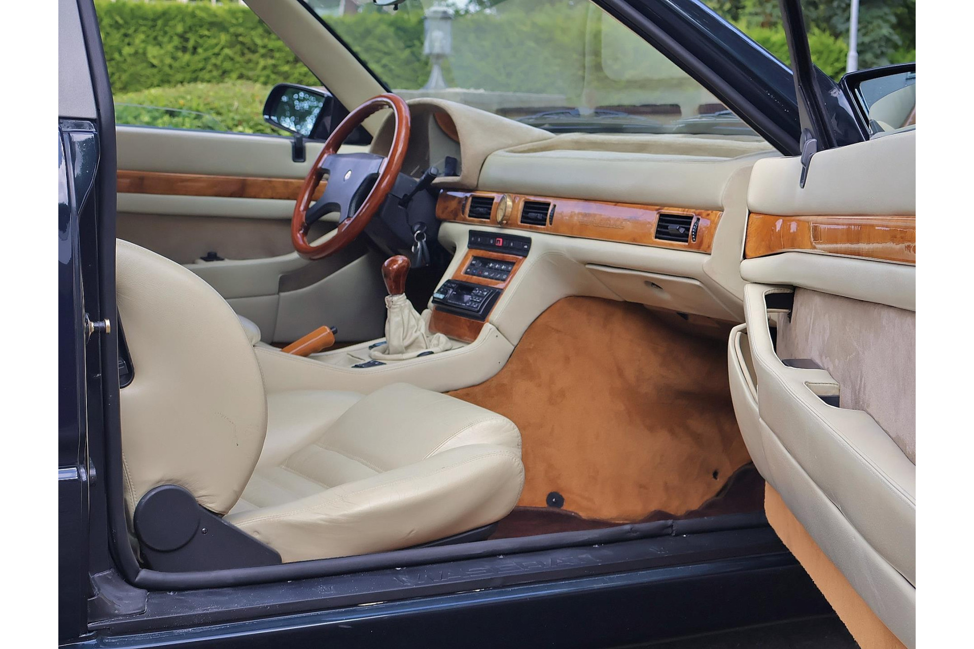 Het bijpassende Avorio lederen interieur met de bruine tapijten, houten interieurlijsten en stuurwiel, alcantara hemelbekleding wordt enkel gezien bij zo’n italiaanse exoot.