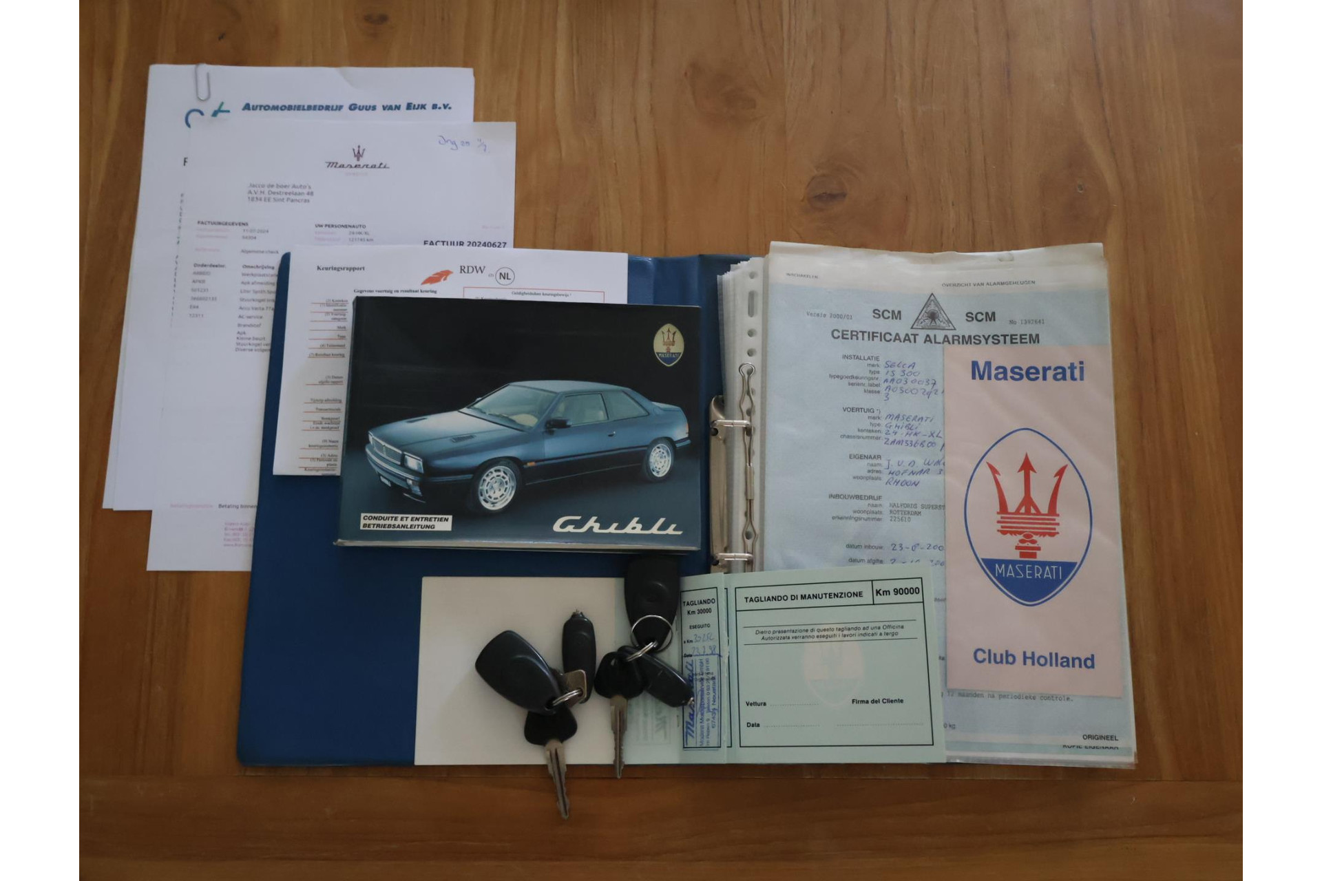 Originele onderhoudsboekje met stempels door de jaren heen is bij de auto met daarin duidelijk de onderhoudsintervallen zichtbaar; allen door Maserati dealer en/of specialisten. Daarnaast aangevuld met een grote map met facturen door de jaren heen die laten zien dat er alles aan gedaan is om deze Ghibli top te onderhouden.